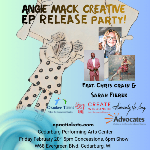 Create Wisconsin, Ozaukee Talent LLC and Sincerely in Song are proud to present an evening of music celebrating Ozaukee Talent & Angie Mack Creative’s 10-year anniversary & EP release of Raggedy Angie. Live performances by Angie, her students and special guests, Chris Crain and Sarah Fierek. Seats fill first come first serve. Concessions available at 5pm.